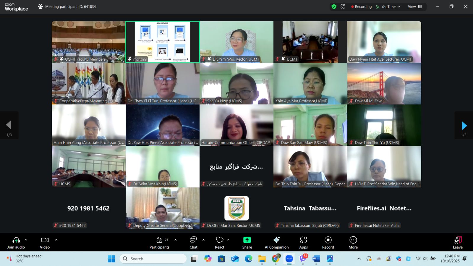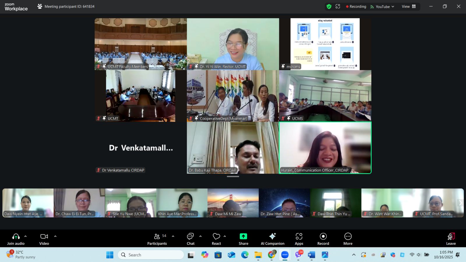 အာရှနှင့်ပစိဖိတ်ဒေသဆိုင်ရာ ကျေးလက်ဒေသဖွံ့ဖြိုးတိုးတက်ရေးဗဟိုဌာန (Centre on Integrated Rural Development for Asia and the Pacific - CIRDAP)နှင့် သမဝါယမနှင့်စီမံခန့်ခွဲမှု ပညာတက္ကသိုလ်(သန်လျင်)တို့ ပူးပေါင်းစီစဉ်ဆောင်ရွက်မှုဖြင့် CIRDAP အတွင်းရေးမှူးချုပ်ရုံးမှ ကြီးမှူး၍ “How can we make Agri-cooperatives sustainable, enterprising & profitable; Success story of Mulkanoor Cooperative, India” ခေါင်းစဉ်ဖြင့် Online Webinar ကို ၁၆-၁၀-၂၀၂၅ ရက်နေ့၊ နံနက် ၁၁ နာရီ ၃၀ မိနစ်မှ နေ့လယ် ၁၃ နာရီ ၁၀ မိနစ်အထိ Zoom Platform ကို အသုံးပြု၍ ကျင်းပပြုလုပ်ခဲ့ပါသည်။ အဆိုပါ Webinar တွင် CIRDAP မှ Communication Officer Ms. Hurain Jannat က Coordinator အဖြစ် ဆောင်ရွက်ပြီး အိန္ဒိယနိုင်ငံ၊ Mulkanoor ကျေးလက် ငွေစုငွေချေးနှင့်ဈေးကွက်ရှာဖွေရေး သမဝါယမအသင်းလီမိတက်၏ ဥက္ကဋ္ဌ Shri Aligi Reddy Praveen Reddy က Honourable Speaker အဖြစ် ရှင်းလင်း ဆွေးနွေးဟောပြောခဲ့ပါသည်။ Webinar သို့ CIRDAP မှ ညွှန်ကြားရေးမှူးချုပ်ကိုယ်စား သုတေသနညွှန်ကြားရေးမှူး Director Dr. Ganga Dutta Acharya ၊ Program Officer Dr. Babu Kaji Thapa နှင့် တာဝန်ရှိသူများ၊ CIRDAP အဖွဲ့ဝင်နိုင်ငံအသီးသီးမှ ကိုယ်စားလှယ်များ၊ သမဝါယမဦးစီးဌာန၊ ဒုတိယညွှန်ကြားရေးမှူးချုပ် ဦးအောင်ပြည့်စိုးနှင့် ညွှန်ကြားရေးမှူးများ၊ CIRDAP Myanmar မှ ညွှန်ကြားရေးမှူး ဒေါက်တာဇာနည်မင်းနှင့် ကျေးလက်ဒေသဖွံ့ဖြိုးတိုးတက်ရေးဦးစီးဌာန၊ နိုင်ငံတကာဆက်ဆံရေး ဌာနခွဲမှ တာဝန်ရှိသူများ၊ သမဝါယမနှင့်စီမံခန့်ခွဲမှုပညာတက္ကသိုလ်(သန်လျင်)မှ ပါမောက္ခချုပ် ဒေါက်တာရီရီဝင်းနှင့် ဆရာ၊ ဆရာမ၊ ဝန်ထမ်း (၁၂၇)ဦးနှင့် သမဝါယမနှင့်စီမံခန့်ခွဲမှုပညာတက္ကသိုလ် (စစ်ကိုင်း)မှ ပါမောက္ခချုပ် ဒေါက်တာဥမ္မာစံနှင့် ဆရာ၊ ဆရာမ (၃၂)ဦး တက်ရောက်ခဲ့ကြပါသည်။