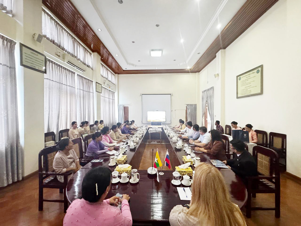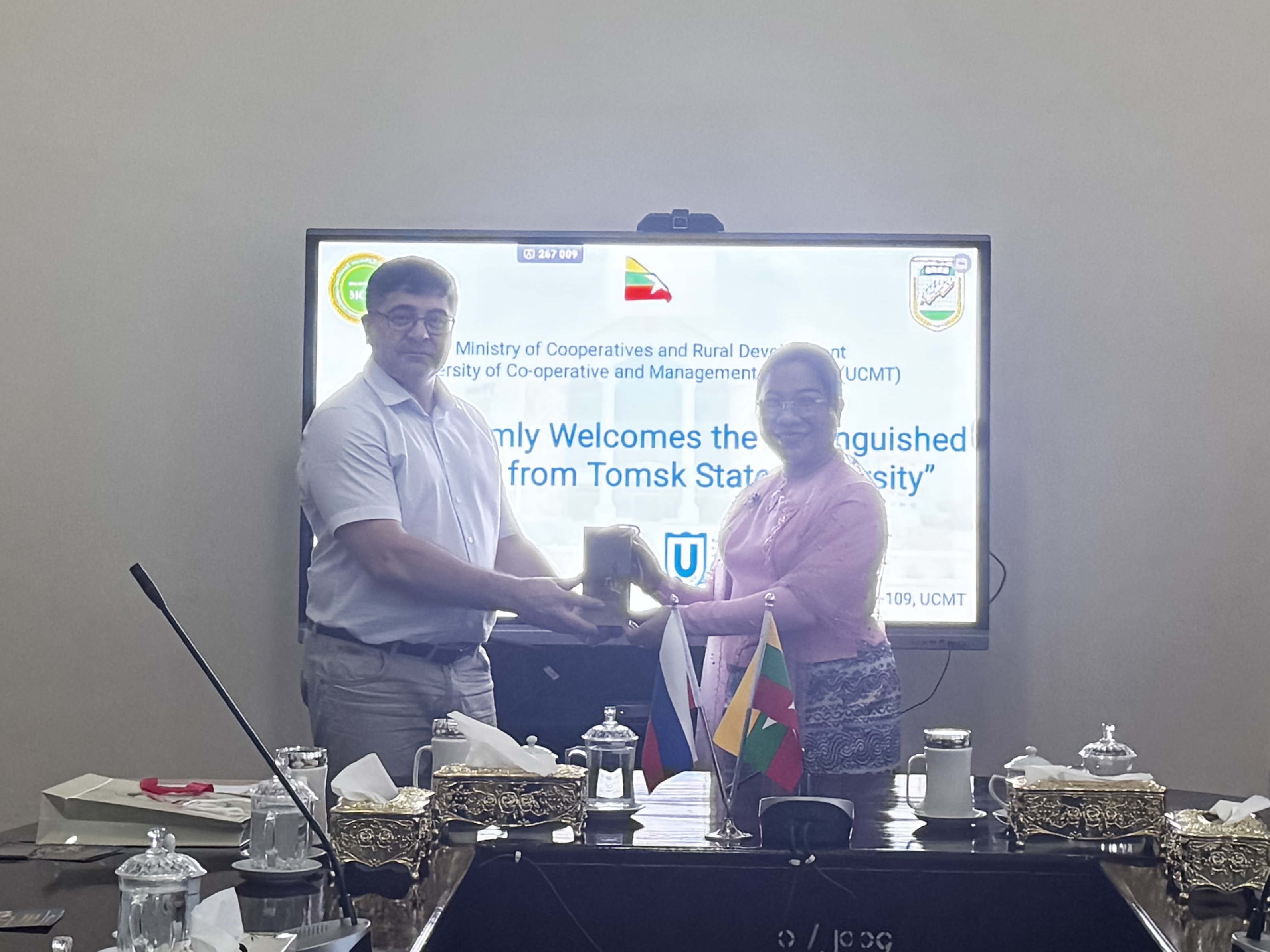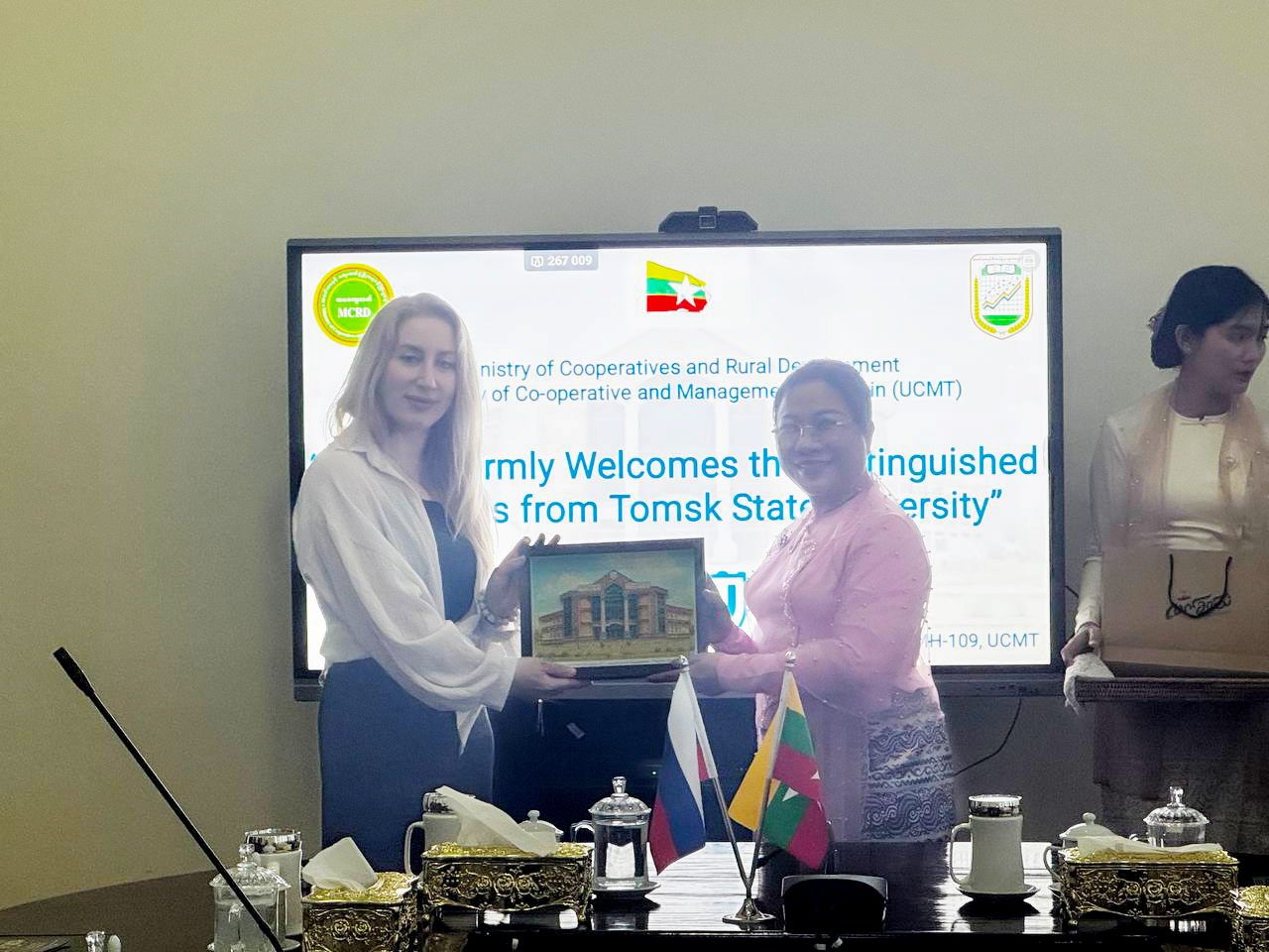 ရုရှားဖက်ဒရေးရှင်းနိုင်ငံ၊ တွန်(စ်ခ်)ပြည်နယ် အမျိုးသားသုတေသနတက္ကသိုလ် (Tomsk State University - TSU) မှ ပါမောက္ခ Mrs. Trifonova Ekaterina Borisovna (ဌာနမှူး၊ နိုင်ငံတကာဆက်ဆံရေးမဟာဌာန) ဦးဆောင်သည့် ကိုယ်စားလှယ်အဖွဲ့ဝင် (၄)ဦးသည် ပညာရေး၊ နည်းပညာဆိုင်ရာဖွံ့ဖြိုးတိုးတက်မှုကိစ္စရပ်များတွင် ပူးပေါင်းဆောင်ရွက်နိုင်ရေးအတွက် သမဝါယမနှင့် စီမံခန့်ခွဲမှုပညာတက္ကသိုလ်(သန်လျင်)သို့ ယနေ့ နံနက် ၁၀ နာရီအချိန်တွင် ရောက်ရှိရာ ပါမောက္ခချုပ် ဒေါက်တာရီရီဝင်းနှင့် ပါမောက္ခ၊ ဌာနမှူးများက ကြိုဆိုခဲ့ကြသည်။ ဦးစွာ ပါမောက္ခချုပ် ဦးဆောင်သည့်အဖွဲ့နှင့် ကိုယ်စားလှယ် (၄)ဦးတို့သည် အပြန်အလှန်မိတ်ဆက်၍ တွေ့ဆုံဆွေးနွေးပွဲကို စတင်ခဲ့ပါသည်။ ၎င်းနောက် ပါမောက္ခချုပ်က သမဝါယမနှင့်စီမံခန့်ခွဲမှုပညာတက္ကသိုလ်(သန်လျင်)၏ မှတ်တမ်းဗီဒီယိုအား ပြသခဲ့ပြီး တက္ကသိုလ် (၂)ခု ပူးပေါင်း၍ ဆရာ၊ ဆရာမများနှင့် ကျောင်းသား၊ ကျောင်းသူများ အပြန်အလှန်ဖလှယ်နိုင်ရေးကိစ္စရပ်များနှင့် ပူးတွဲသုတေသနလုပ်ငန်းများ ဆောင်ရွက် နိုင်ရေး ကိစ္စရပ်များနှင့်စပ်လျဉ်း၍ ရှင်းလင်းဆွေးနွေးပြောကြားခဲ့သည်။ ထို့နောက် တွန်(စ်ခ်)ပြည်နယ် အမျိုးသားသုတေသနတက္ကသိုလ်မှ ပါမောက္ခ Mrs. Trifonova Ekaterina Borisovna က ရုရှားဖက်ဒရေးရှင်းနိုင်ငံ၊ တွန်(စ်ခ်)ပြည်နယ် အမျိုးသားသုတေသနတက္ကသိုလ် (Tomsk State University - TSU) ၏ နိုင်ငံတကာအဆင့် ဆောင်ရွက်မှုများနှင့်စပ်လျဉ်း၍ ပညာရေးနှင့် သုတေသန ရည်မှန်းချက်များကို အကောင်အထည်ဖော်ဆောင်ရွက်ရာတွင် အာရှနိုင်ငံများတွင် ပိုမိုအလေးအနက်ထား ဆောင်ရွက်လျက်ရှိပါကြောင်း၊ တက္ကသိုလ်တွင် အာရှနိုင်ငံများမှ တက်ရောက်သည့် ကျောင်းသား ဦးရေ ၅၈% အထိ တိုးများလာပြီဖြစ်ပါကြောင်း၊ အာရှနိုင်ငံများရှိ တက္ကသိုလ်များနှင့်လည်း သဘောတူညီချက်များရေးထိုး၍ နှစ်ဦးနှစ်ဖက်ပူးပေါင်းမှုများ ဆောင်ရွက်လျက်ရှိပါကြောင်း၊ တက္ကသိုလ်တွင် နိုင်ငံပေါင်း (၈၈)နိုင်ငံမှ ကျောင်းသား၊ ကျောင်းသူပေါင်း (၁၁၄၁၇)ဦး တက်ရောက် ပညာသင်ကြားလျက်ရှိပါကြောင်း ဆွေးနွေးပြောကြားခဲ့ပါသည်။ ဆက်လက်၍ နိုင်ငံတကာမှ ကျောင်းသား၊ ကျောင်းသူများ တက်ရောက်ပညာသင်ကြားနိုင်မည့် ဘွဲ့ကြိုနှင့် မဟာဘွဲ့ Program များနှင့် စပ်လျဉ်း၍ တက္ကသိုလ်မှပေးအပ်သော Scholarship Programme များကိုလည်း ဝင်ရောက်လျှောက်ထားနိုင်ပါကြောင်း မျှဝေပြောကြားခဲ့ပါသည်။ ယင်းနောက် ပါမောက္ခချုပ် ဒေါက်တာရီရီဝင်းနှင့် ပါမောက္ခ Mrs. Trifonova Ekaterina Borisovna တို့သည် အမှတ်တရ လက်ဆောင်များ အပြန်အလှန် ပေးအပ်ခဲ့ကြောင်း သိရှိရသည်။