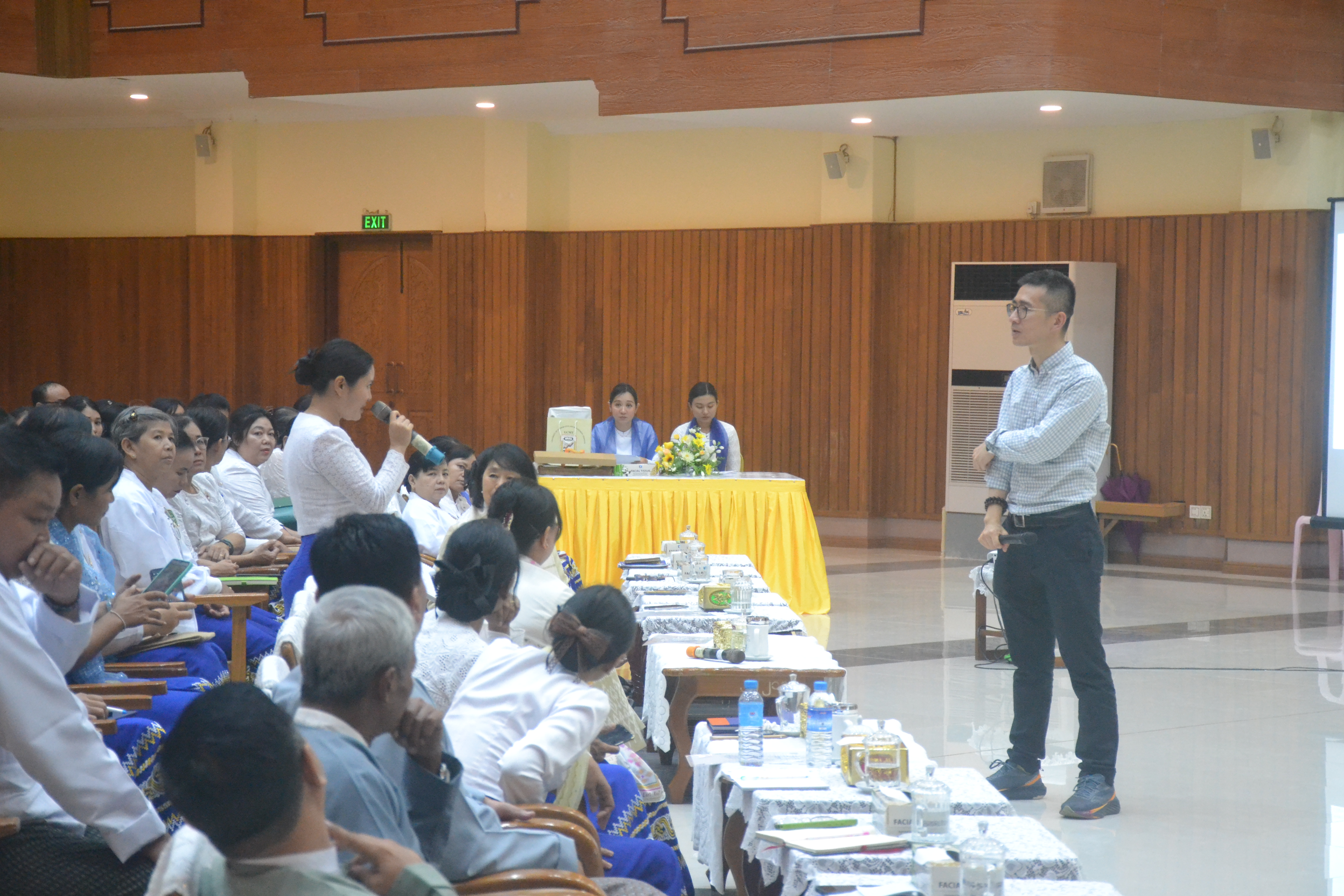 ထို့နောက် UMFCCI အထွေထွေအတွင်းရေးမှူးချုပ် ဒေါ်ခိုင်ခိုင်နွယ်က Knowledge Sharing Session ကျင်းပရခြင်း အဓိကအကြောင်းအရင်းများကို ရှင်းလင်းဆွေးနွေးပြောကြားခဲ့ပါသည်။ ယင်းနောက် တရုတ်ပြည်သူ့ သမ္မတနိုင်ငံ၊ ရှန်ဟိုင်းမြို့၊ ဒုံဟွာတက္ကသိုလ် (Donghua University)၊ Glorious Sun School of Business and Management မှ Vice Dean and Professor Dr. Bin Shen က “One Belt One Road Initiative and its Impact on the Myanmar Textile and Apparel Industry” ခေါင်းစဉ်ဖြင့် ရှင်းလင်းဆွေးနွေးပြောကြားခဲ့ရာ တက်ရောက်လာသည့် ဆရာ၊ ဆရာမများနှင့် ကျောင်းသား၊ ကျောင်းသူများက သိရှိလိုသည်များကို မေးမြန်းဆွေးနွေးခဲ့ကြသည်။ ဆက်လက်၍ Vice Dean and Professor Dr. Bin Shen အား ပါမောက္ခချုပ်က အမှတ်တရလက်ဆောင် ပစ္စည်းများ ပေးအပ်ပြီး စုပေါင်းမှတ်တမ်းတင် ဓာတ်ပုံရိုက်ကူးခဲ့ကြသည်။ အဆိုပါ ဆွေးနွေးပွဲသို့ ပါမောက္ခချုပ်၊ ဒုတိယပါမောက္ခချုပ်(သင်ကြား)၊ ပါမောက္ခ/ ဌာနမှူးများ၊ ဆရာ၊ ဆရာမများနှင့် ကျောင်းသား၊ ကျောင်းသူ ၅၀၀ ကျော် တက်ရောက်ခဲ့ကြောင်း သတင်းရရှိသည်။
