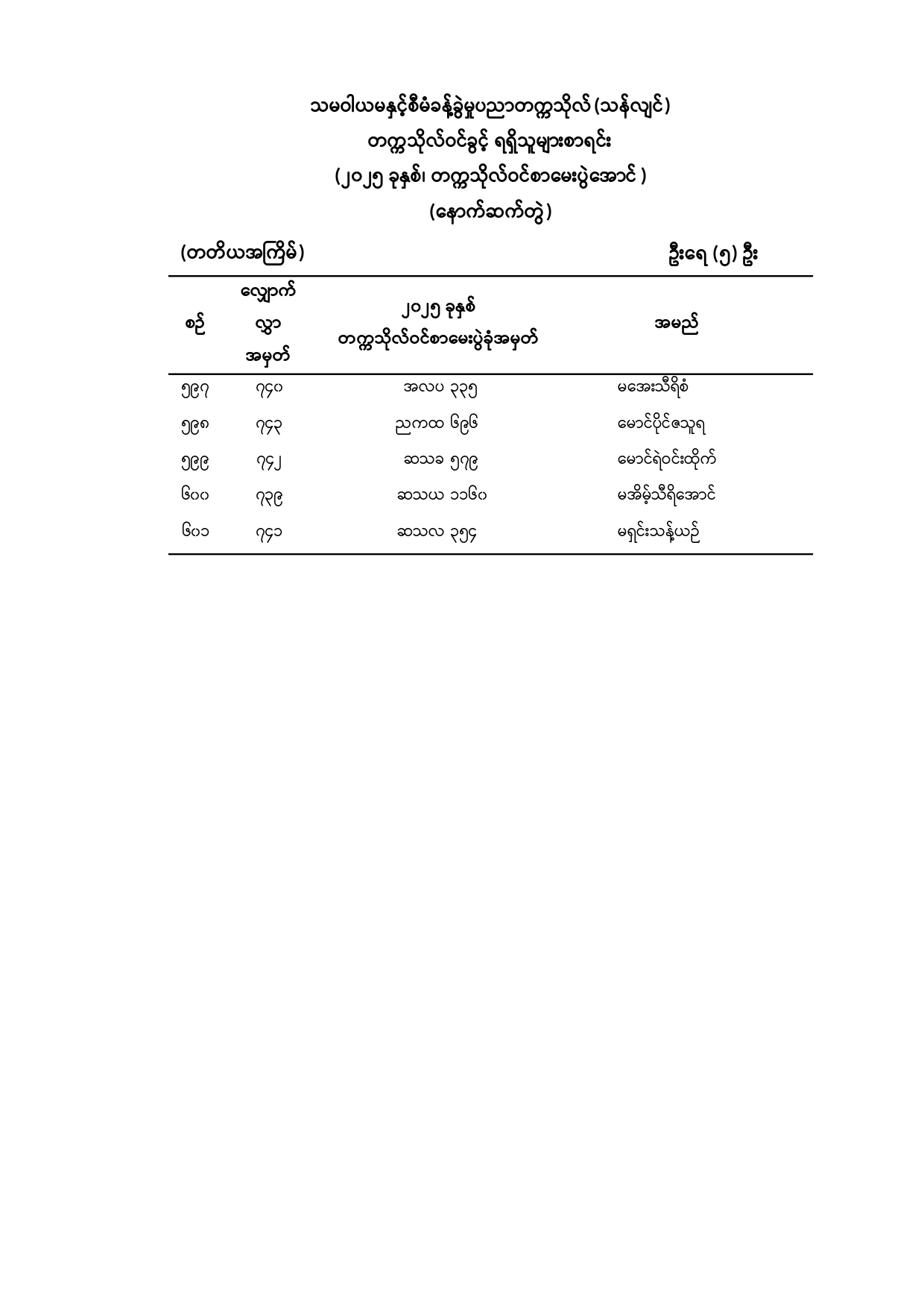သမဝါယမနှင့်စီမံခန့်ခွဲမှုပညာတက္ကသိုလ်(သန်လျင်) ၂၀၂၅ -၂၀၂၆ ပညာသင်နှစ်၊ ပထမနှစ်ဝင်ခွင့် ရရှိသူများစာရင်း (နောက်ဆက်တွဲ)(တတိယအကြိမ်)