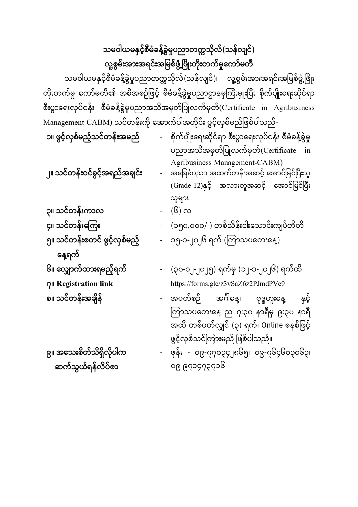 စိုက်ပျိုးရေးဆိုင်ရာ စီးပွားရေးလုပ်ငန်းစီမံခန့်ခွဲမှုပညာအသိအမှတ်ပြုလက်မှတ် (Certificate in Agribusiness Management-CABM) သင်တန်းဖွင့်လှစ်မည်ဖြစ်ကြောင်းကြေညာခြင်း